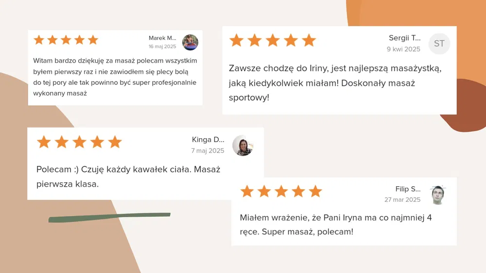 - Masaż gorącymi kamieniami: masaż klasyczny + gorące kamienie (Szybsza regeneracja, lepsza wydolność, mniej napięcia)